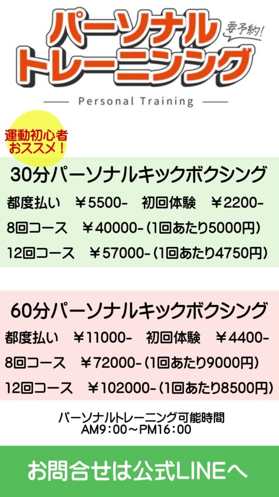 那覇でパーソナルキックボクシングを始めたい方は、まずは**初回体験レッスン(30分:¥2,200/60分:¥4,400)**からお気軽にお試しください。